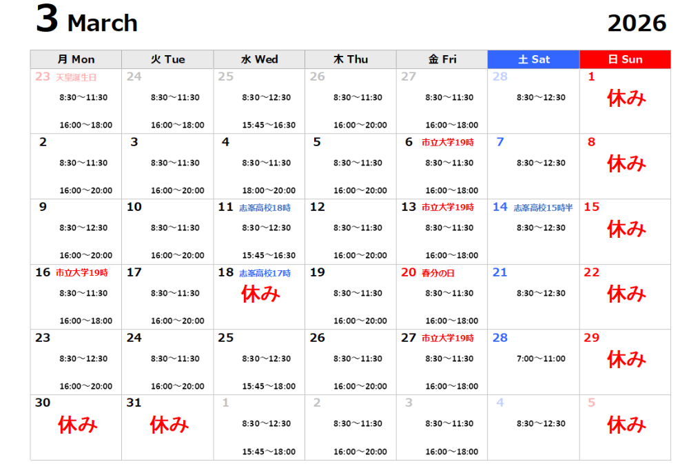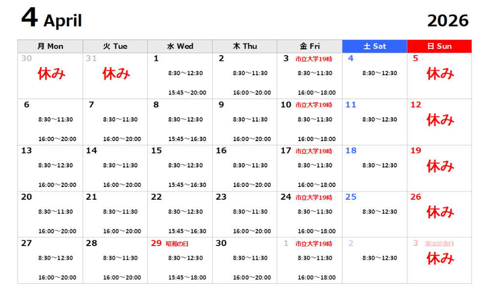 | 介護施設・学生運動部トレーナー活動などの院外業務の為、 受付時間が変わる場合があります。 スケジュール変更は月ごとに掲載しております。ご確認の上ご連絡お願い致します。 |